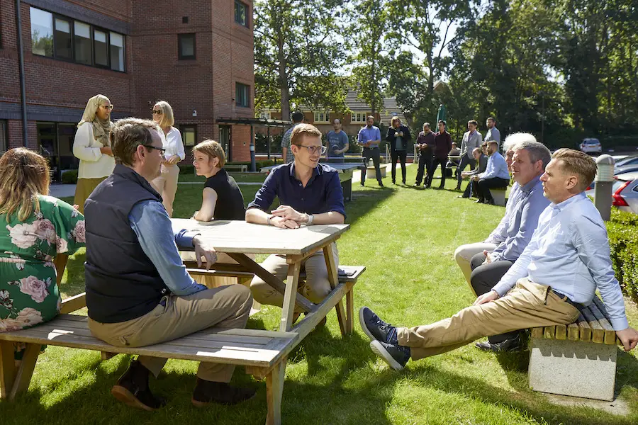 Team relaxing in garden area