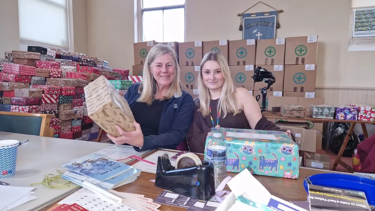 Our team packing Christmas shoeboxes, supporting families who need support during the festive season.