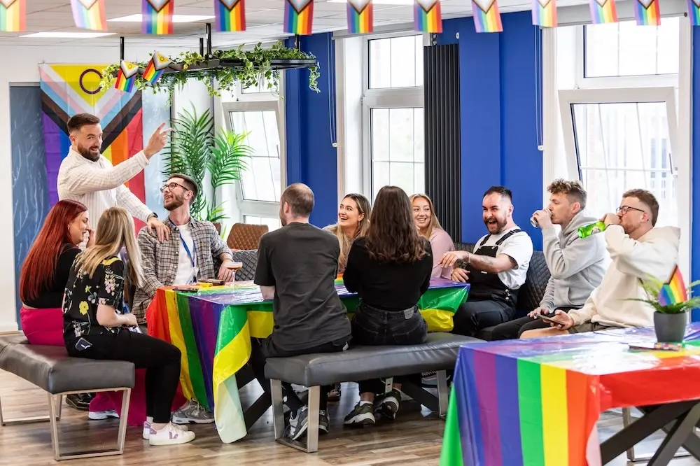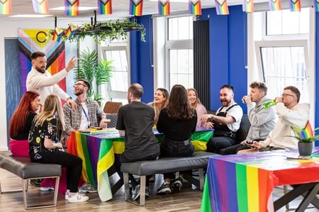 Reward team celebrating Pride with games, a mixologist, and decorations – supporting equality, diversity & inclusion.